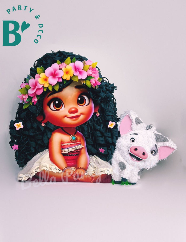 Moana en su versión niña llega acompañada del tierno Pua en esta piñata 2D con relieves. Un dúo encantador que llena la fiesta de ternura y magia. ¡Perfecta para celebraciones temáticas y para sorprender desde el primer vistazo!