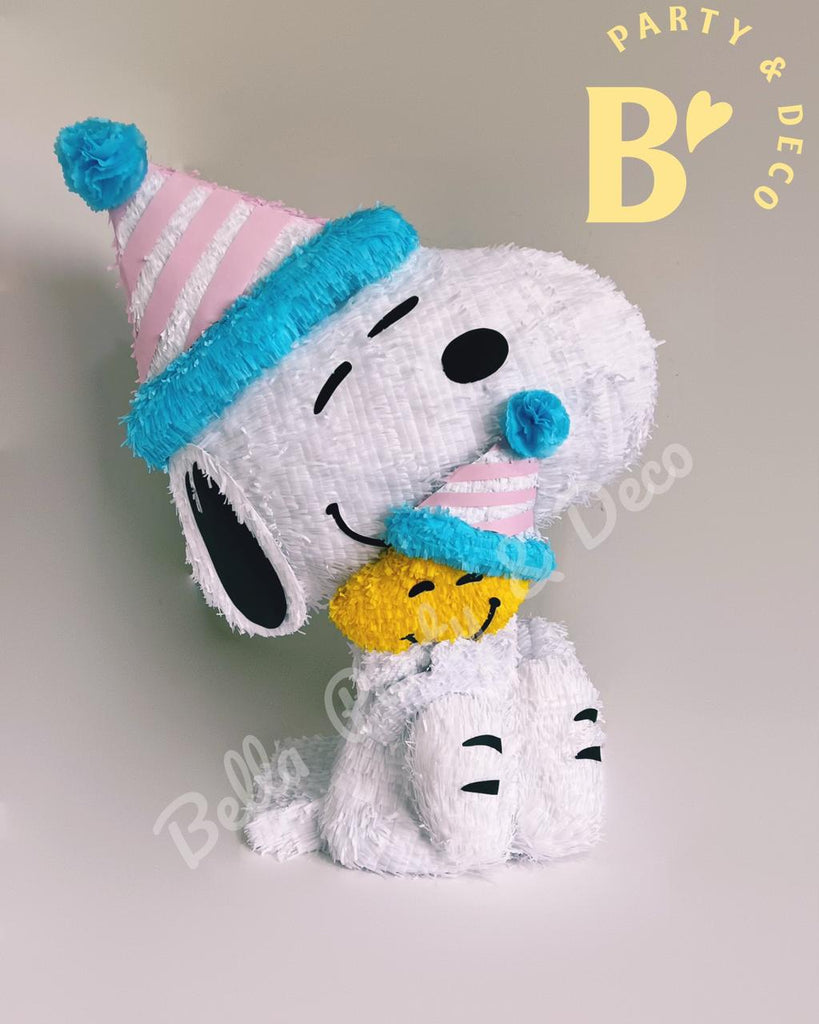 Piñata de Snoopy y Woodstock con gorritos de fiesta.